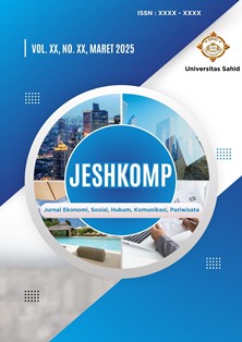 JESHKOMP: Jurnal Ekonomi, Sosial, Hukum, Komunikasi, Pariwisata adalah Open Journal System (OJS) yang diterbitkan empat kali setahun pada Maret, Juni, Semptember dan Desember oleh Lembaga Penelitian dan Pengabdian kepada Masyarakat (LPPM) Universitas Sahid. Berisi tulisan yang diangkat dari hasil pemikiran dan penelitian di bidang ekonomi, sosial, hukum, komunikasi dan pariwisata.